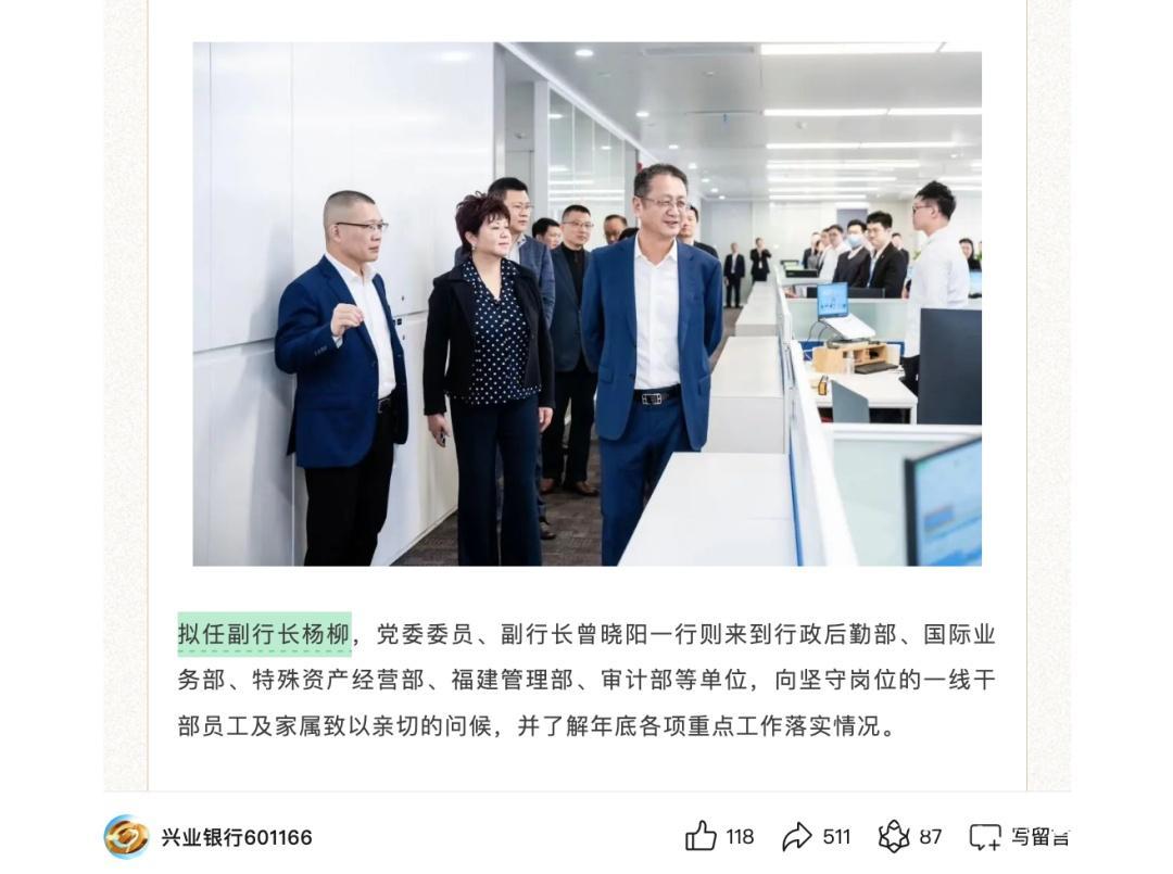 1月2日,兴业银行(601166)官方微信公众号发布一篇标题为“福建省率领造访慰问兴业银行年终决算干部职工”推文,内文提到2024年12月31日晚拟任副行长杨柳到行政后勤部、海外业务部等单元慰问年终决算干部职工。